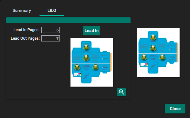 If the job has been submitted as a LILO job, a LILO tab will be visible which displays the Lead In page count and the Lead Out page count which can both be edited if the job is in the Waiting Queue. A thumbnail of the Lead In page is shown, clicking on the button above the thumbnail changes it to the Lead Out thumbnail. A larger version of the LILO thumbnail can be displayed if you click on the zoom button or the LILO thumbnail.