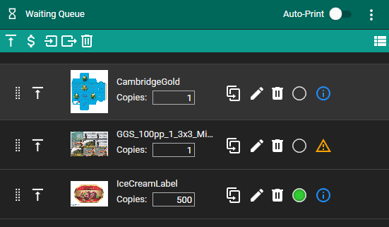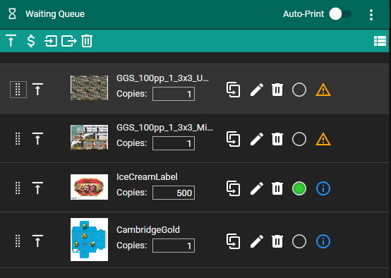 Enabling the Auto-Print option ensures that all pre-processed jobs in the Waiting Queue automatically move directly to the Print Queue (unless they are identified as incompatible).
