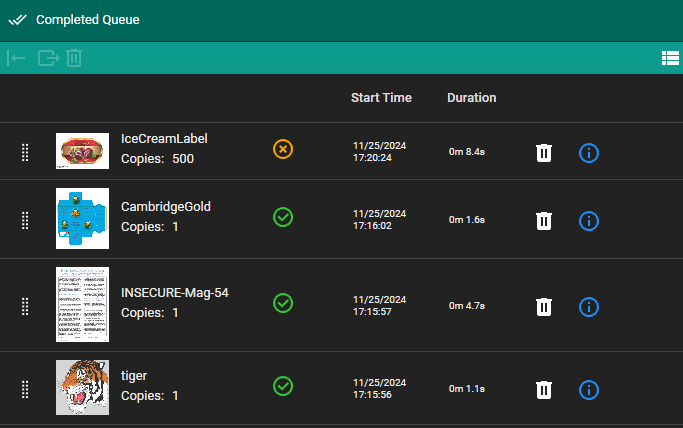 Each job in the Completed Queue displays in a single row, which displays the following columns: