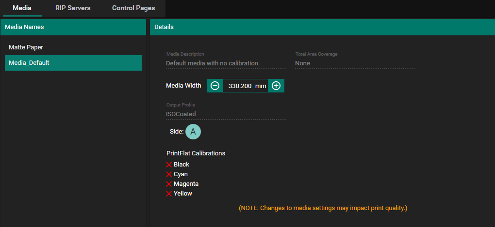 The media characteristics are defined in the Engineer Pane; for more details see the Engineer Pane section of this guide.