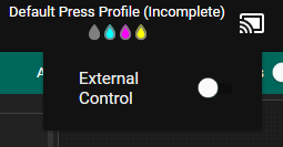 This shows whether Smart Print Controller's (SPC) OPC UA Server is enabled. The icon will be green if external control is enabled, white if it is connected, or not present if the OPC UA Server has been deactivated in the Engineer pane.