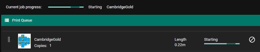 This enables the Stop and Abort buttons and changes the color of the Start icon to green, which indicates that the print run started.
