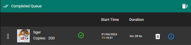 The printing status changes from Starting to Printing once output is being produced. Once completed, the job then moves to the Completed Queue.