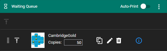 Use the Up arrow to the left of the thumbnail to move the job from the Waiting Queue to the Print Queue.