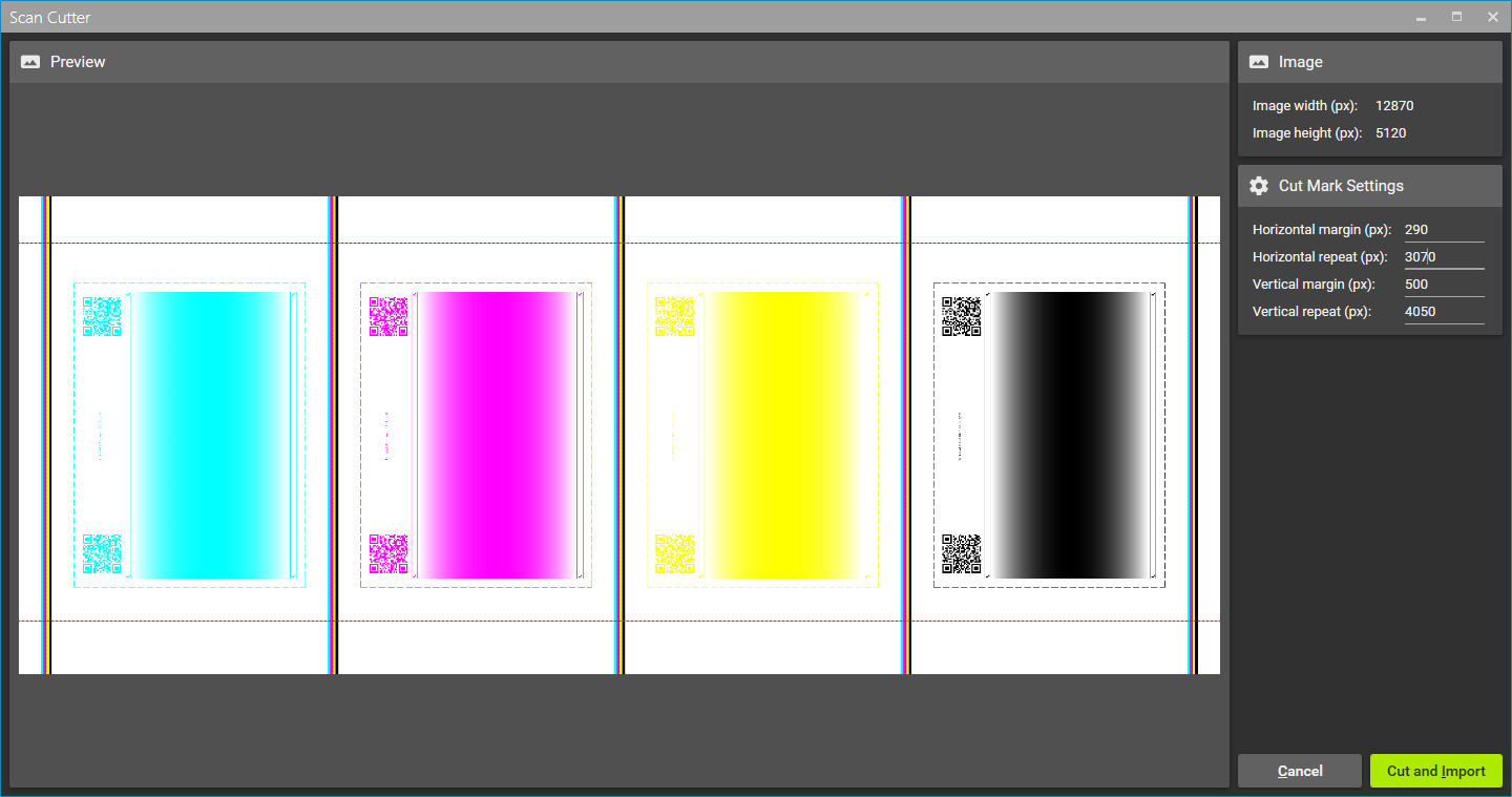 Once the cut lines have been correctly arranged, pressing the "Cut and Import" button will start the process of sub-dividing the image and importing it into PrintFlat Create.