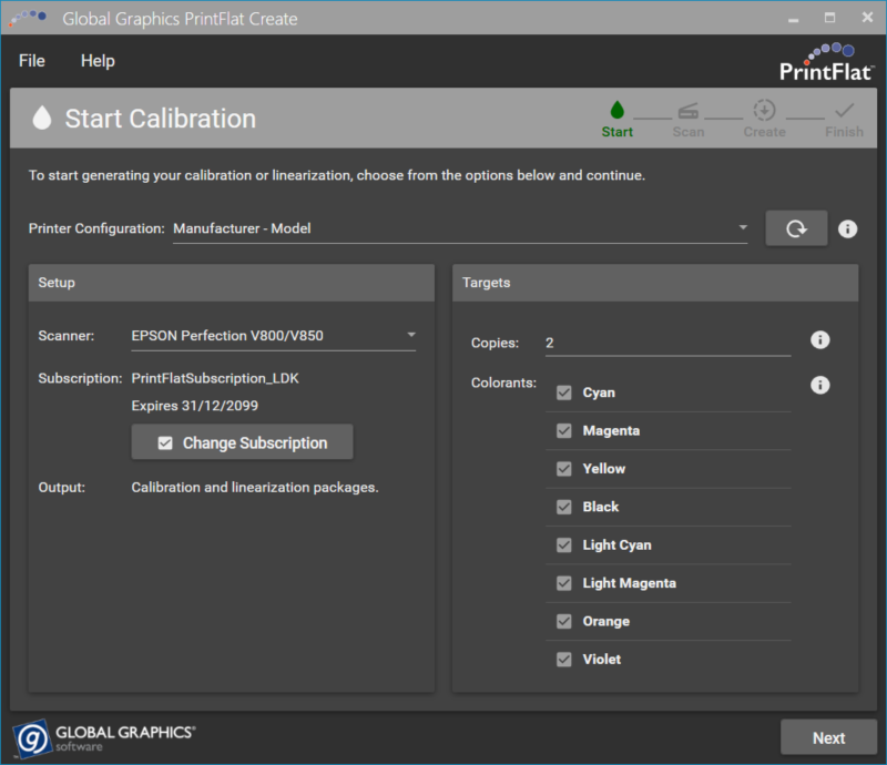 If PrintFlat Create is set up with multiple printers, select the printer that should be calibrated from the “Printer Configuration” drop-down list. If PrintFlat Create is not set up with multiple printers, the drop-down list will not be shown.
